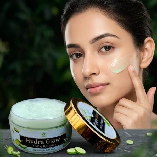 Hydra Glow – All Day Hydration Moisturizer is a lightweight gel-cream formula designed to deeply hydrate, refresh, and revive your skin throughout the day. Infused with the natural goodness of aloe vera, cucumber, and mint extracts, it delivers instant cooling, long-lasting moisture, and a healthy, radiant glow without feeling greasy. Perfect for daily use, it keeps your skin soft, plump, and naturally glowing.